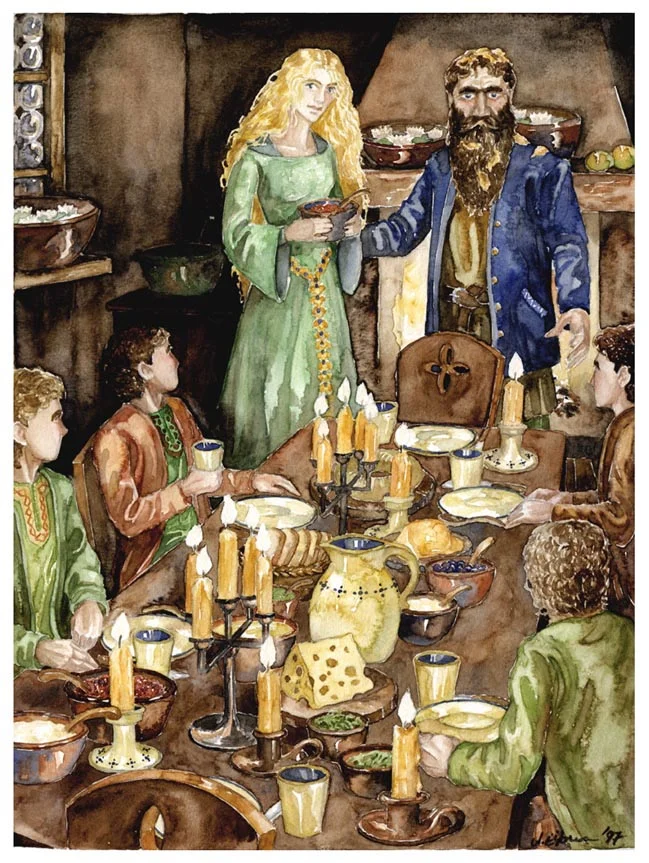 ‘Here’s my pretty lady!’ he said, bowing to the hobbits. ‘Here’s my Goldberry clothed all in silver-green with flowers in her girdle! Is the table laden? I see yellow cream and honeycomb, and white bread, and butter; milk, cheese, and green herbs and ripe berries gathered. Is that enough for us? Is the supper ready?’